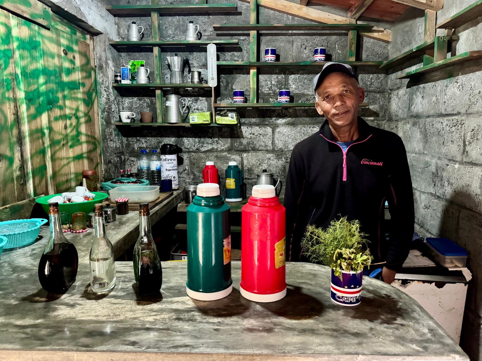 Towards the top of the mountain we stopped at a small hut, where the warden uses grog (Rum made with sugar cane) to make a couple of other flavoured alcohols, and also brews tea and coffee for the visitors. He has an ingenious setup to catch water. The mountain is often covered by cloud and there is a system to capture the water vapour and have it run to a small cistern. He uses this water to grow a few vegetables in a small garden area.