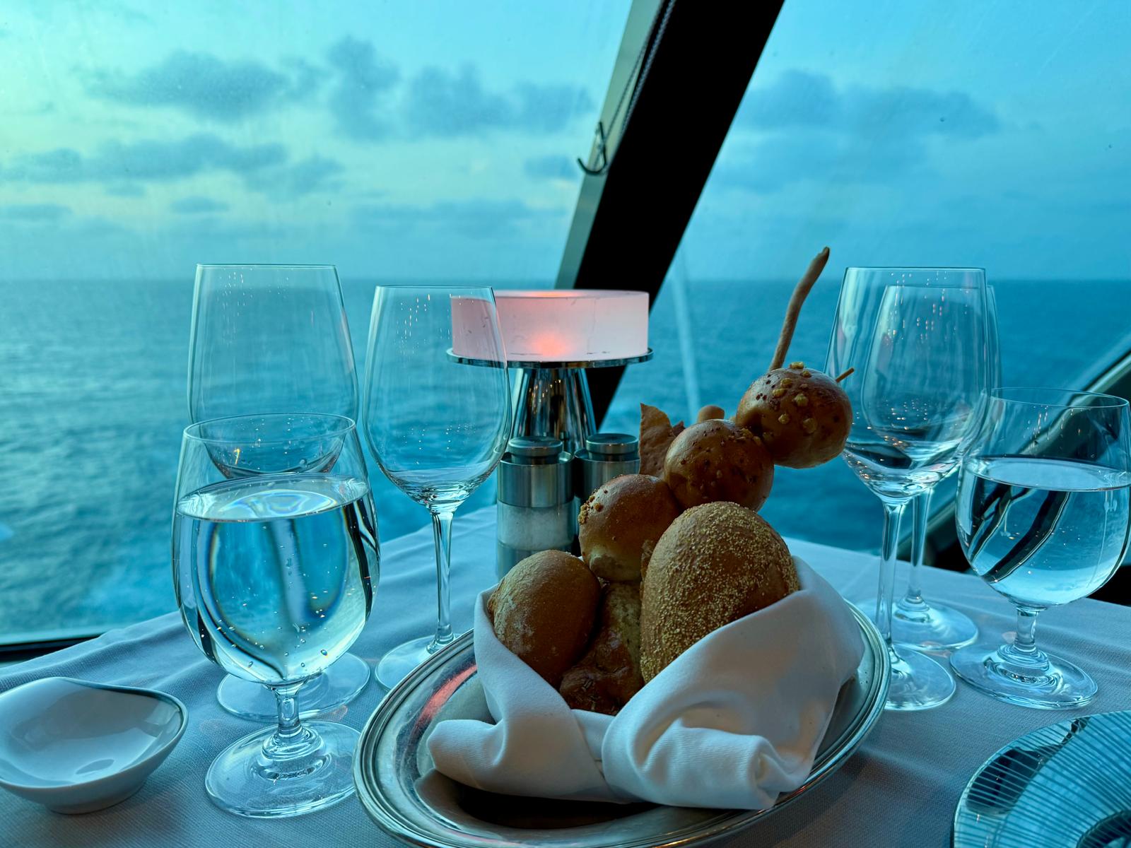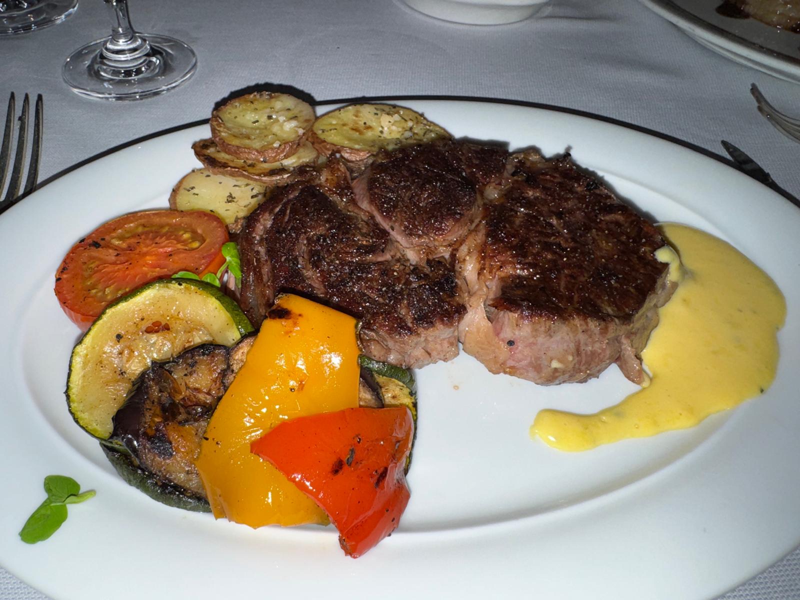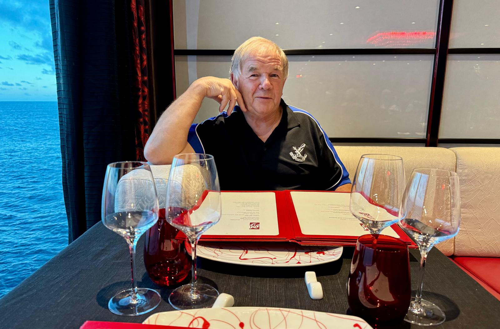Late afternoon Roger had his usual cigar and G&T… We had a 6:30pm reservation at the Tuscan Steak specialty restaurant and enjoyed a delicious dinner overlooking the stern of the boat.