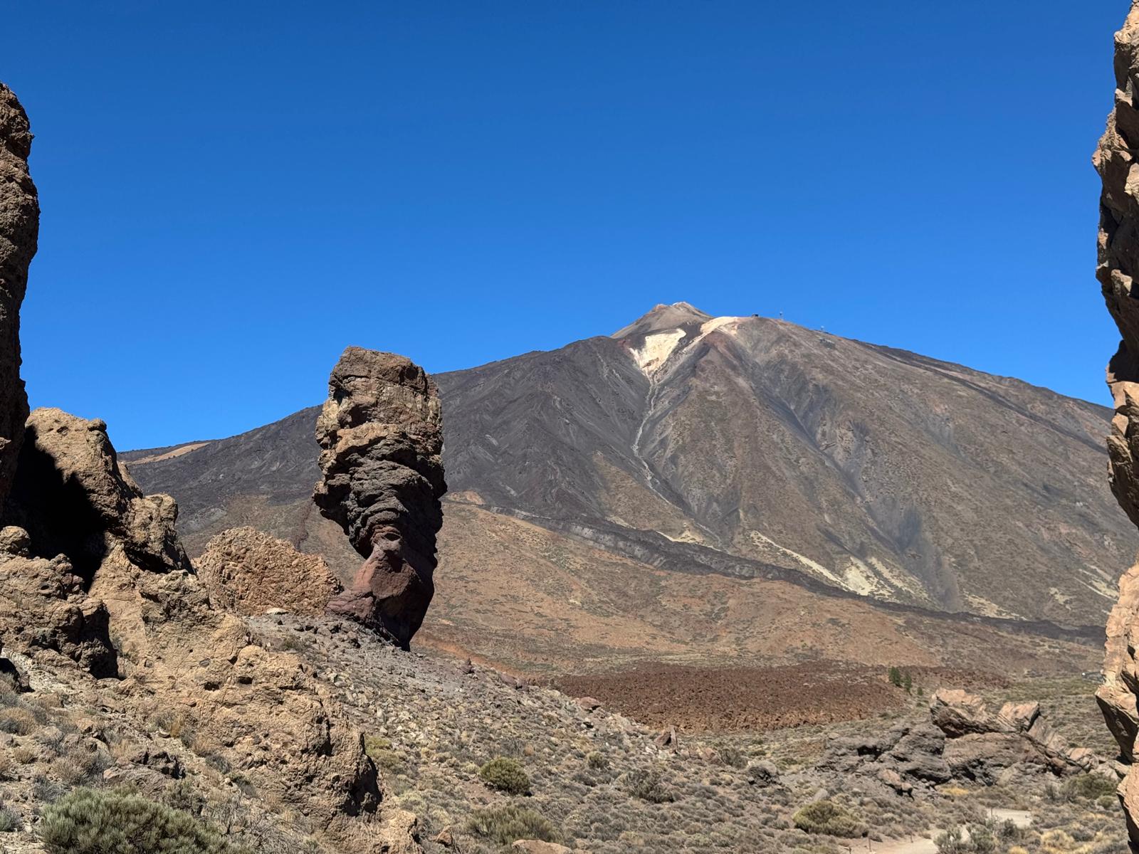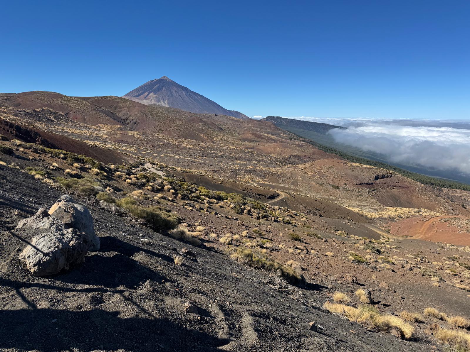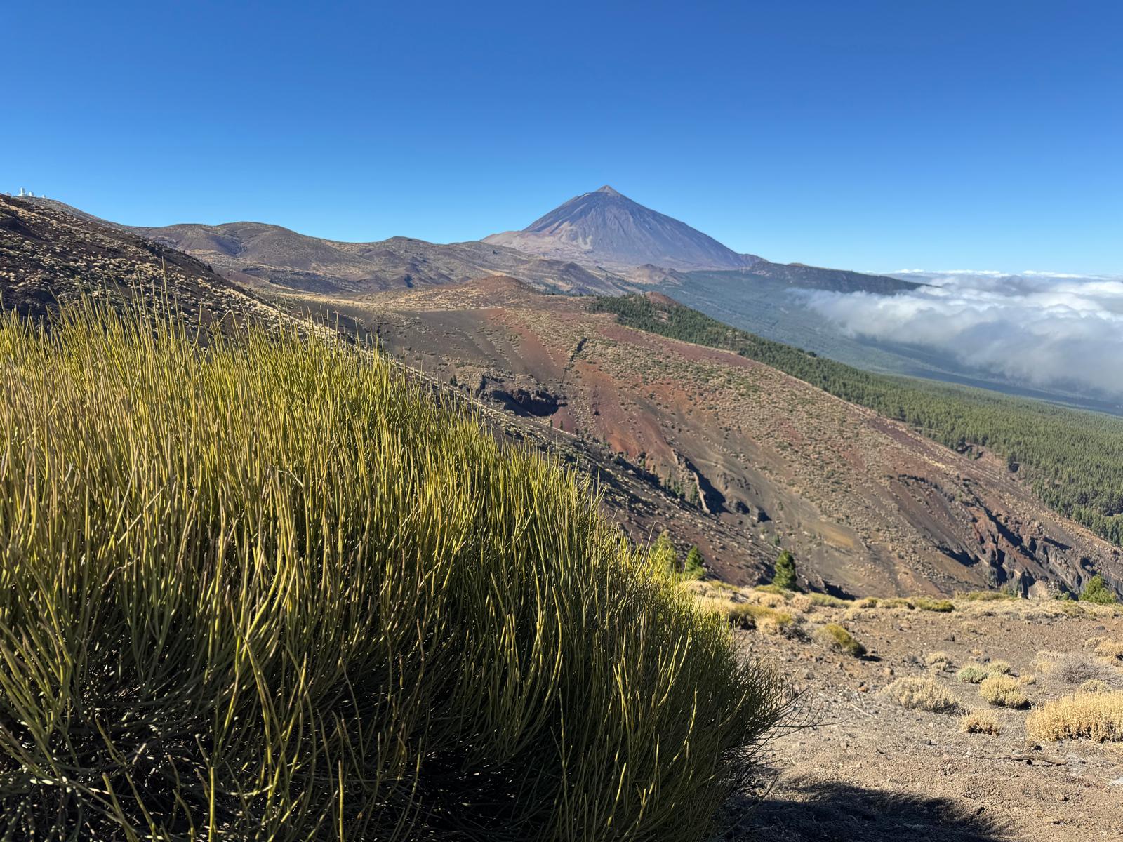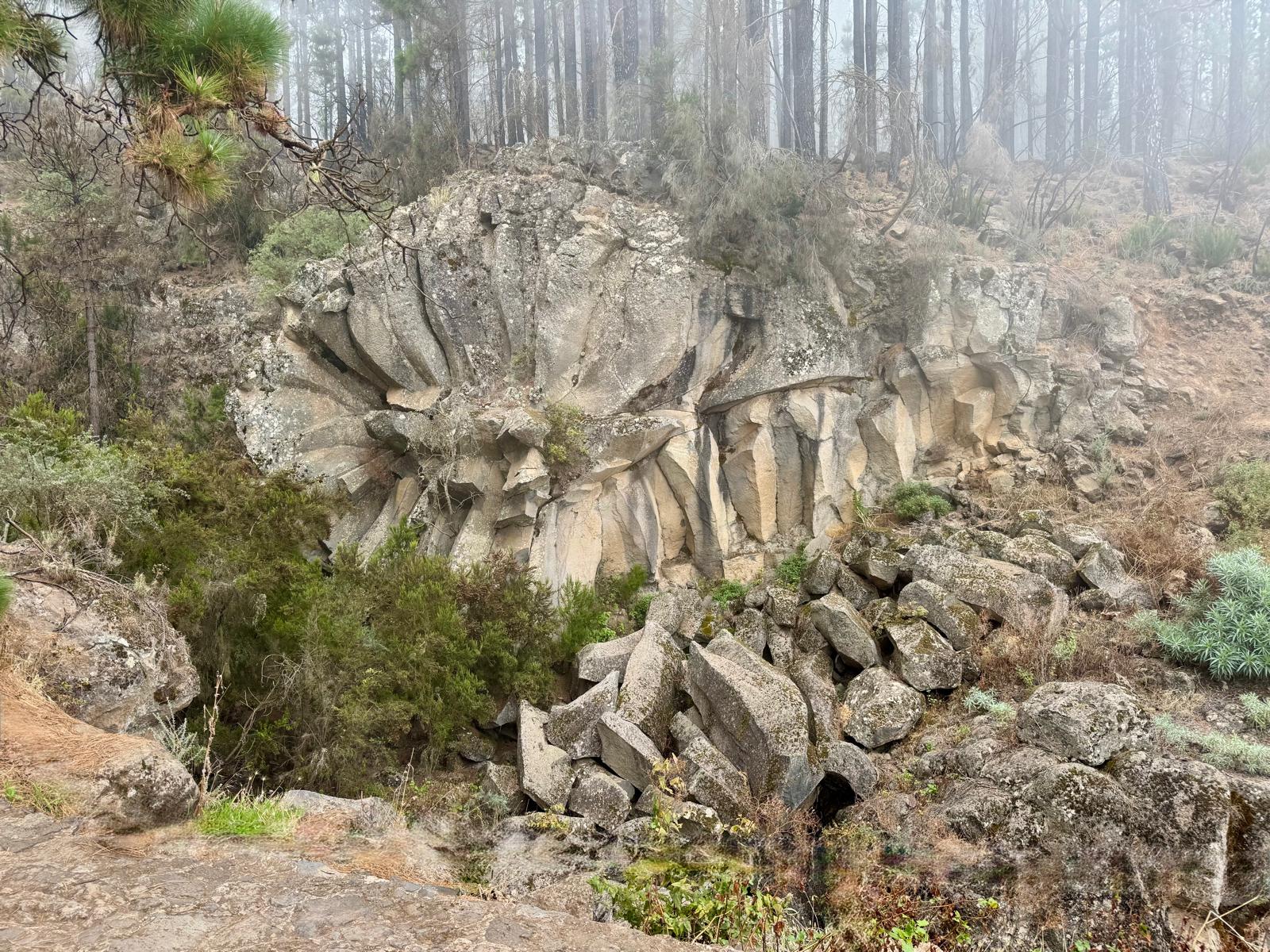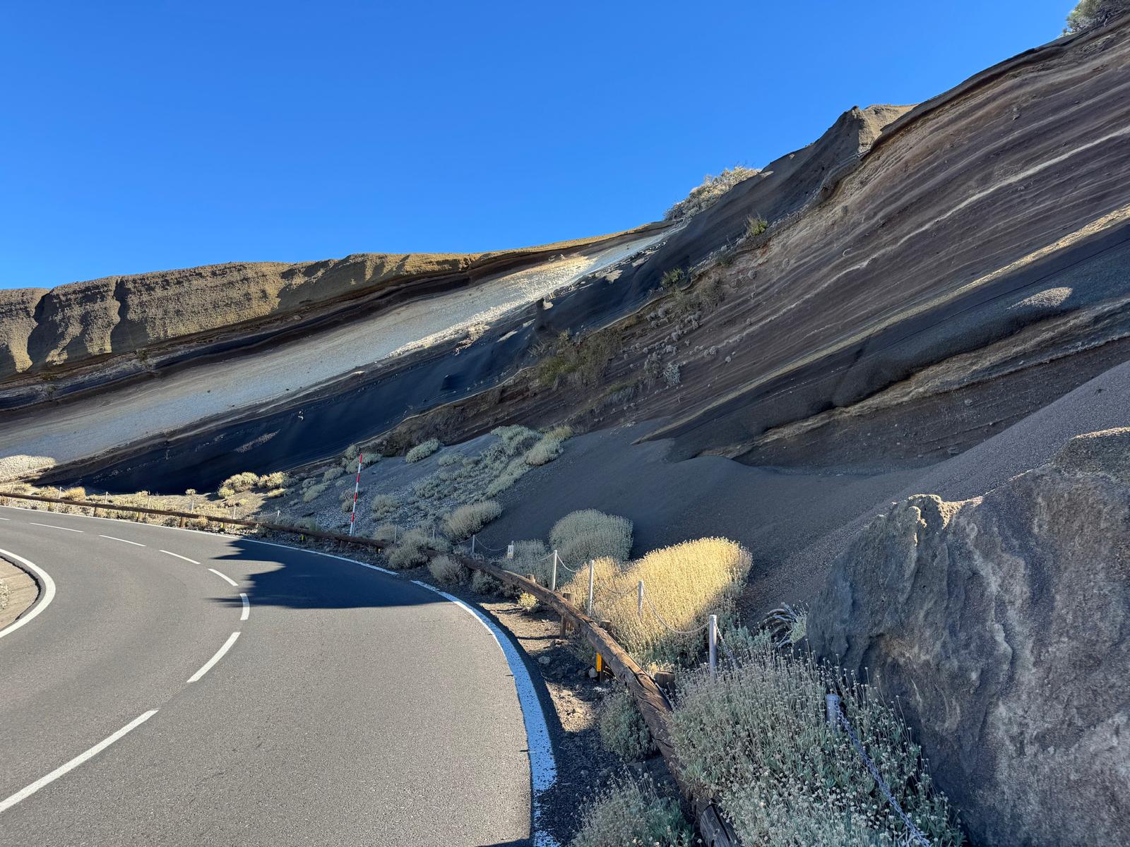 From there we began heading for the hills and up into the mist through a large cedar forest. This had recently had a fire through it, which the trees survived as their bark somehow closes up and can withstand temperatures of several hundred degrees. Maria was stuck on send and had talked non-stop since she had picked us up. Sylvia had a polite word to her and we were privileged to some moments of silence. At around 1900 meters we came out of the mist into clear blue skies. We continued up the hill, stopping from time to time to look at the views across the mist below. At one point we could see the top of La Palma, a nearby island. Lots of cyclists were heading up and down the hill, one of whom was getting some repairs from the local ambulance after he had come a cropper. In places we could see the layers from the different eruptions over hundreds of years.