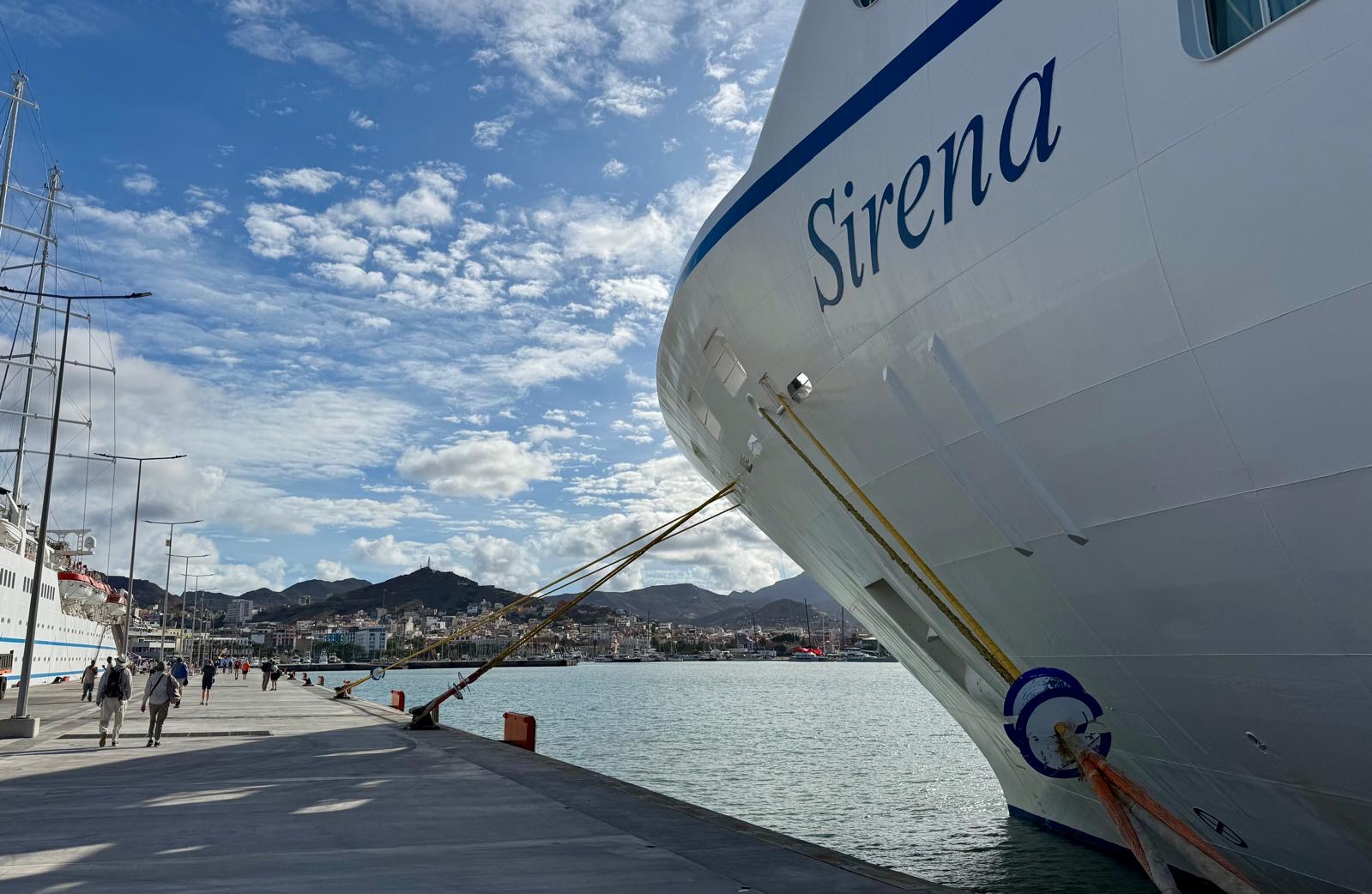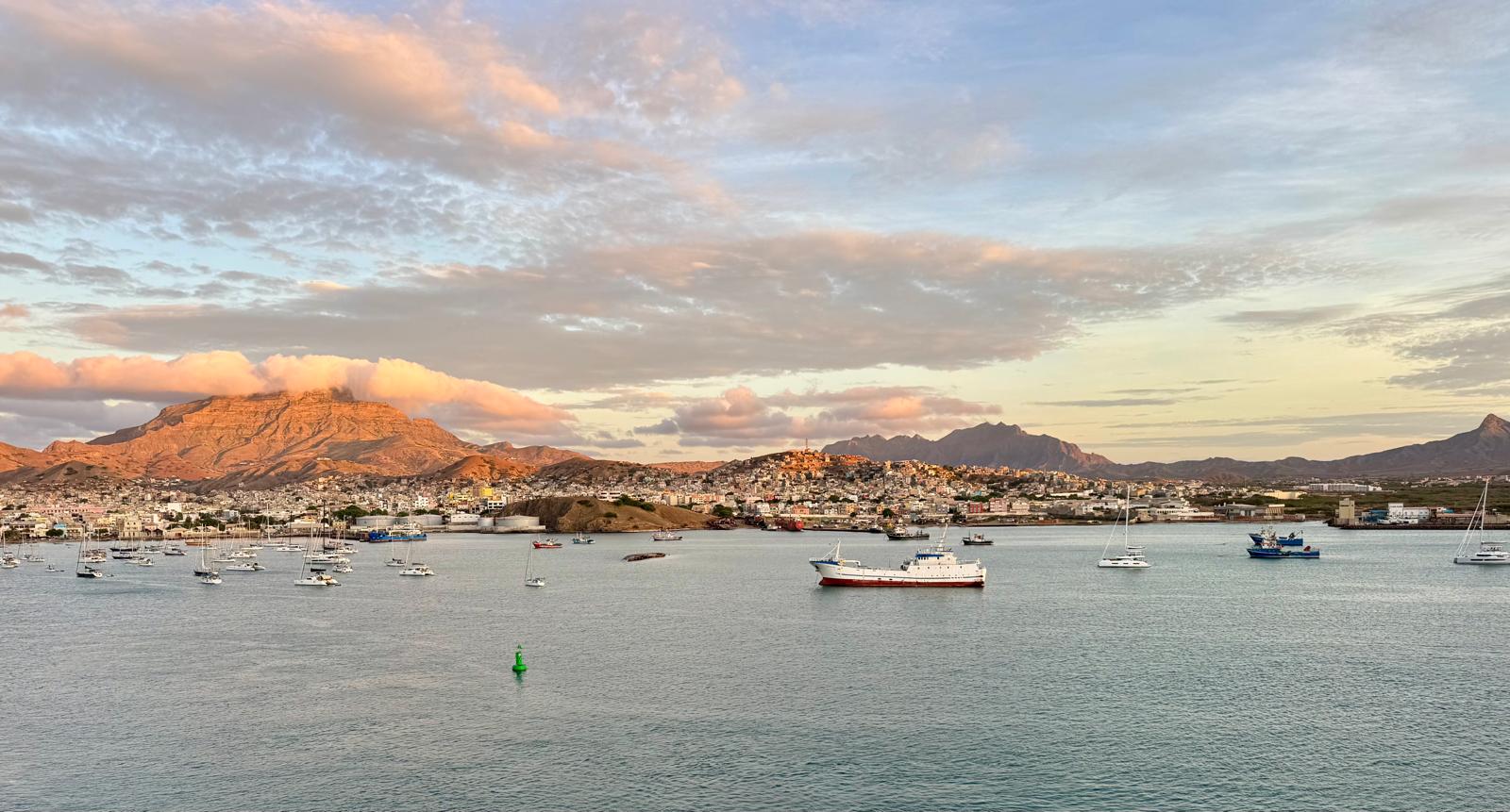 Just before 7am I headed up to the gym for a stretching class, followed by an ab workout. Roger headed up to use the elliptical trainer. We watched from the gym as we entered the harbour at Mindelo, with the sun rising over the surrounding hills. It looks a pretty place but very barren.