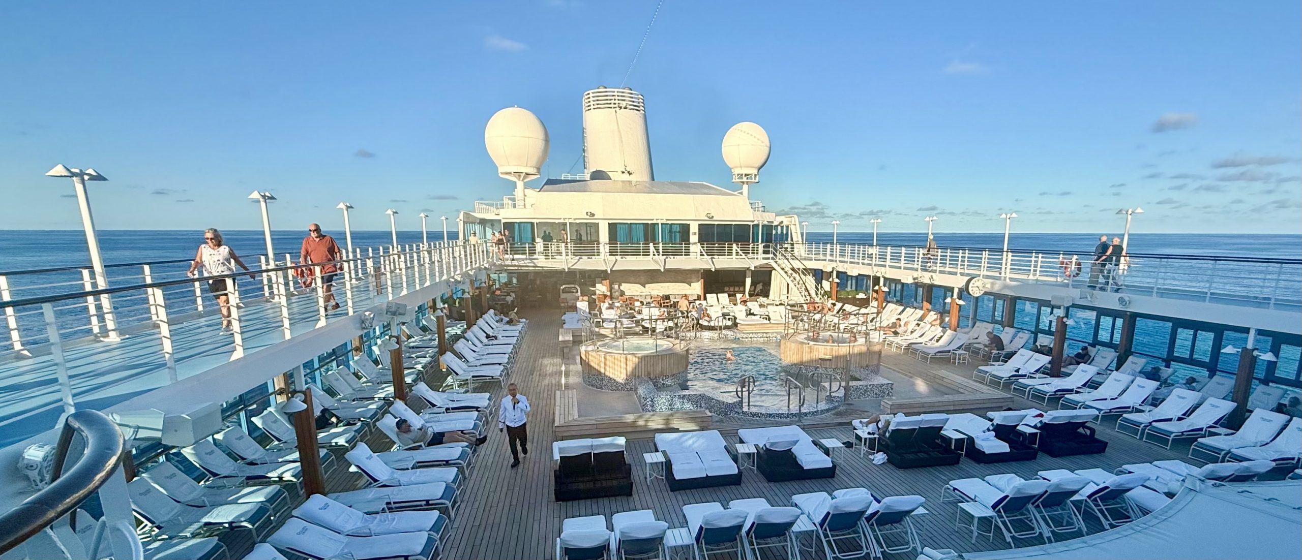 Today was once again a sea day. Sylvia headed to a stretch class while I clocked up a few kms on the elliptical machine. This was followed by a walk around the walking track on deck 10, which overlooks the pool on deck nine; 13 laps is one nautical mile or ~1800m.