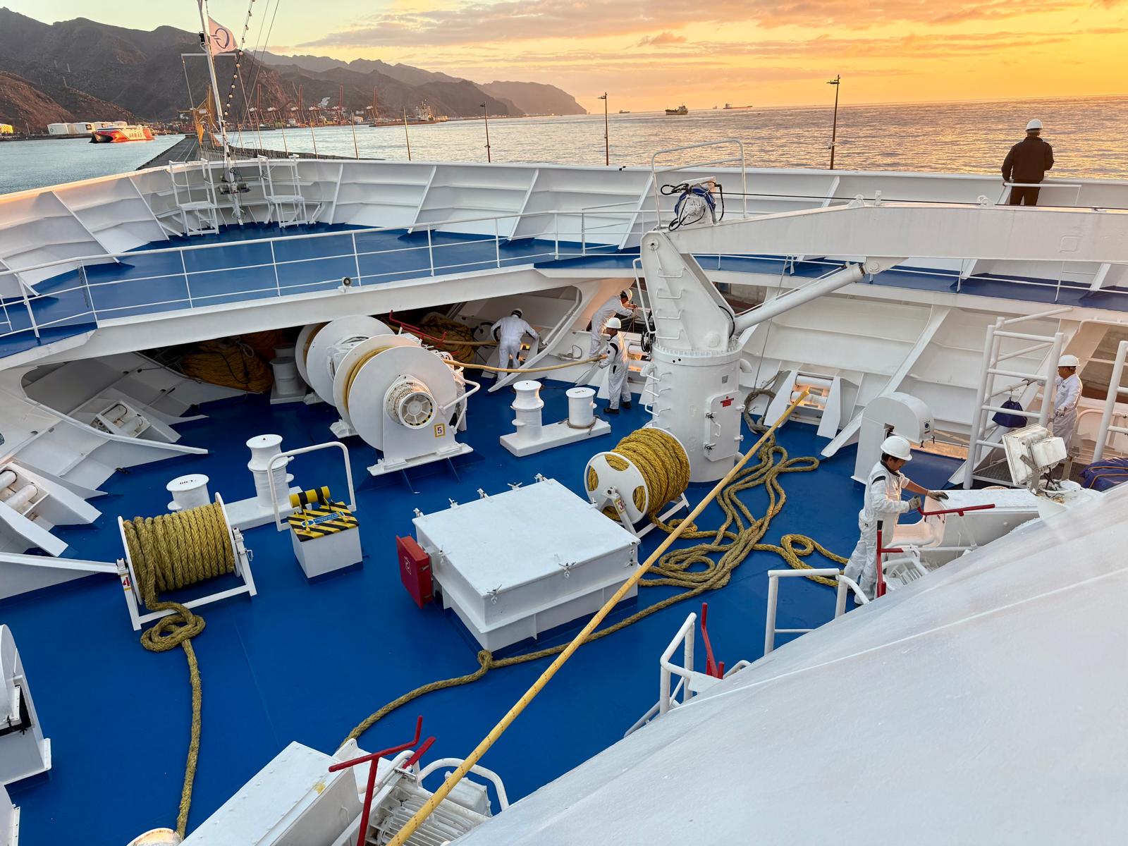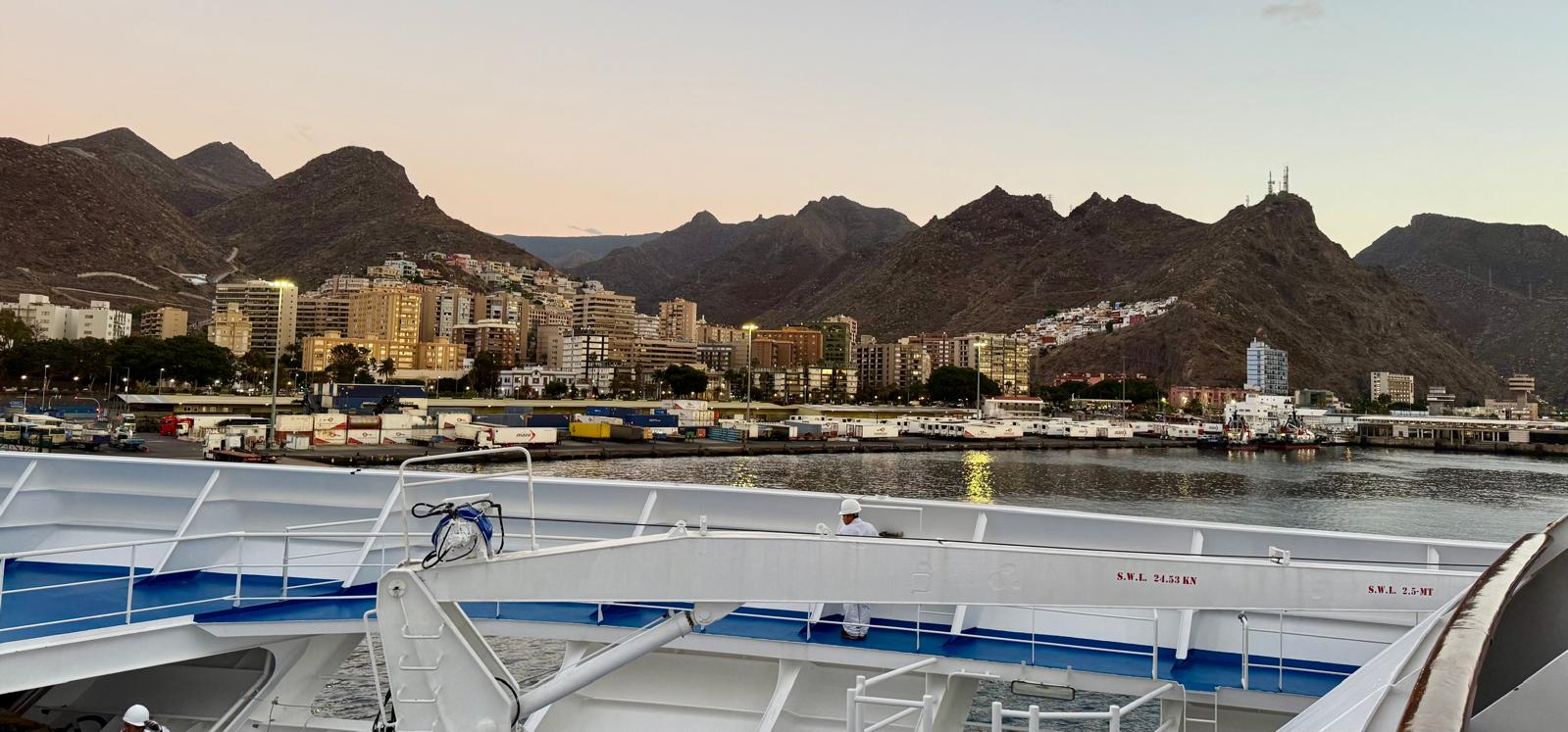 It was about 7am when the ship did a 180 degree turn and sidled into the berth at Santa Cruz. I watched from our balcony as the crew threw thin lines to those onshore, to which the heavy ropes were then attached and pulled ashore, then attached to the steel bollards on the wharf. Large winches then tensioned up the lines to hold the ship in place. There are five or six of these lines at each end of the ship holding the 30,000 ton vessel in place. Round discs are put on the ropes to stop the local rats getting on board.