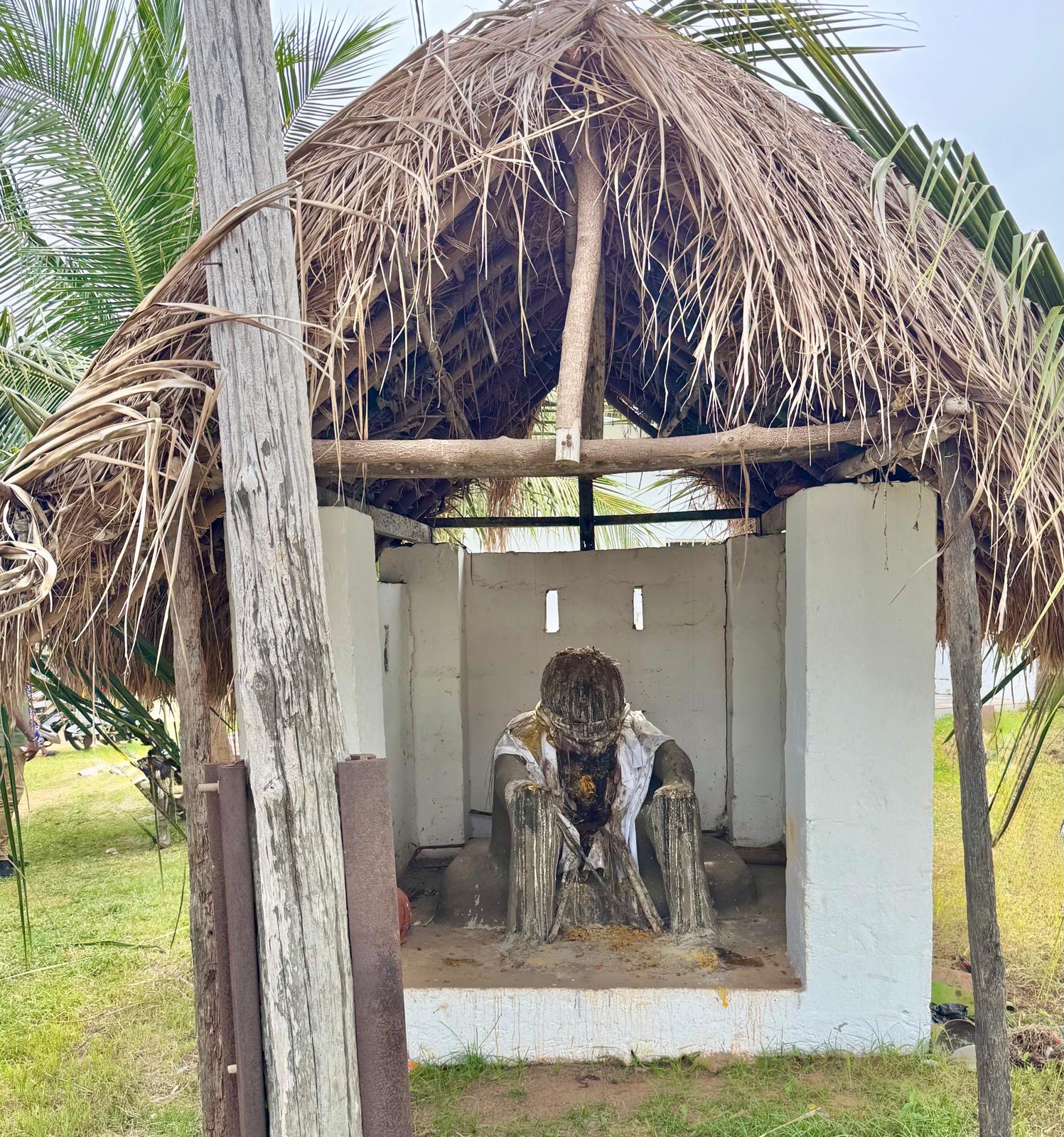 Back on dusty roads we eventually arrived at what we were told was a forest. It turned out to be a group of buildings on the edge of a forest. We dismounted and gathered around a statue figure. As the guide stated speaking an altercation took place as one of the locals tried to remove the guides boom box that her microphone was routed through.