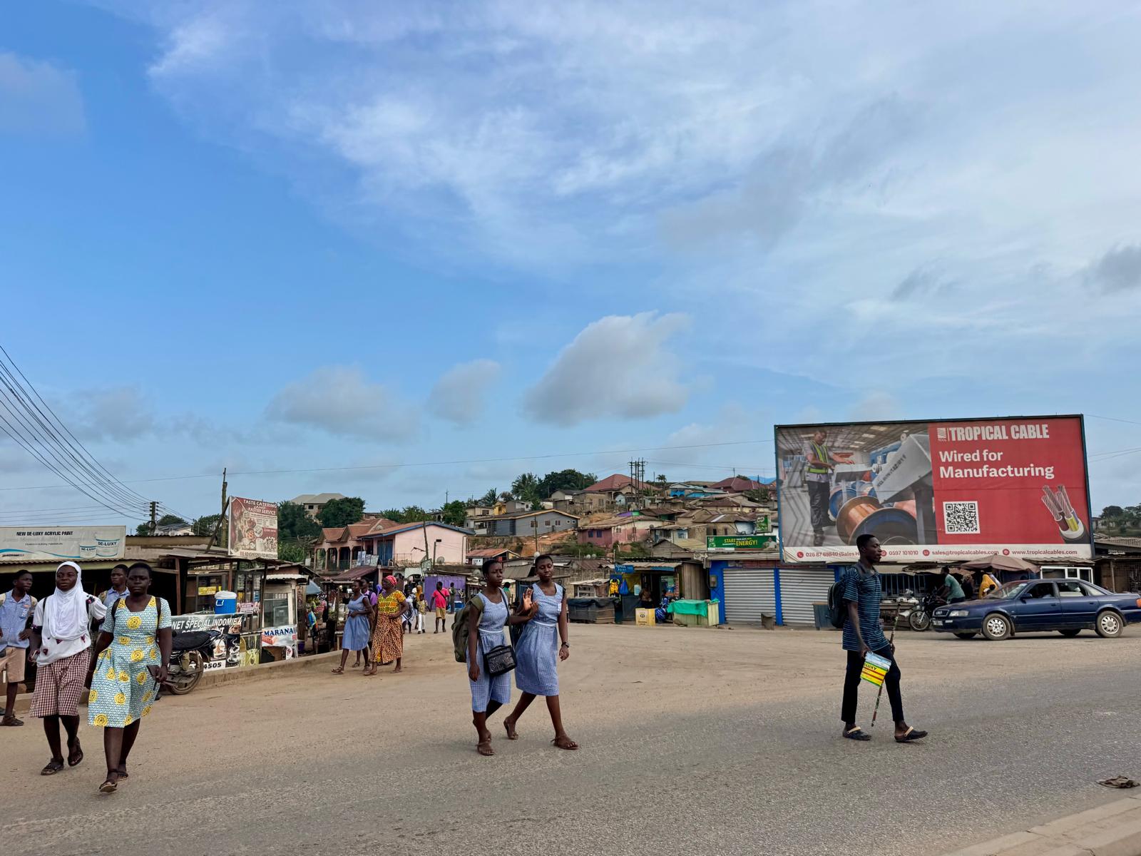 We drove past multiple local market areas bustling with people and with lots of plantains, cassava, pineapples, mangoes, watermelon and other fruits and vegetables on display. Sheep, goats and chickens wandered about freely. Straight-backed women, men and even children carried all sorts of loads on their heads. Some looked very heavy. Women stood at the side of the road with big basins of cold drinks, plantain chips and other snack foods on their heads trying to sell them to passing motorists.