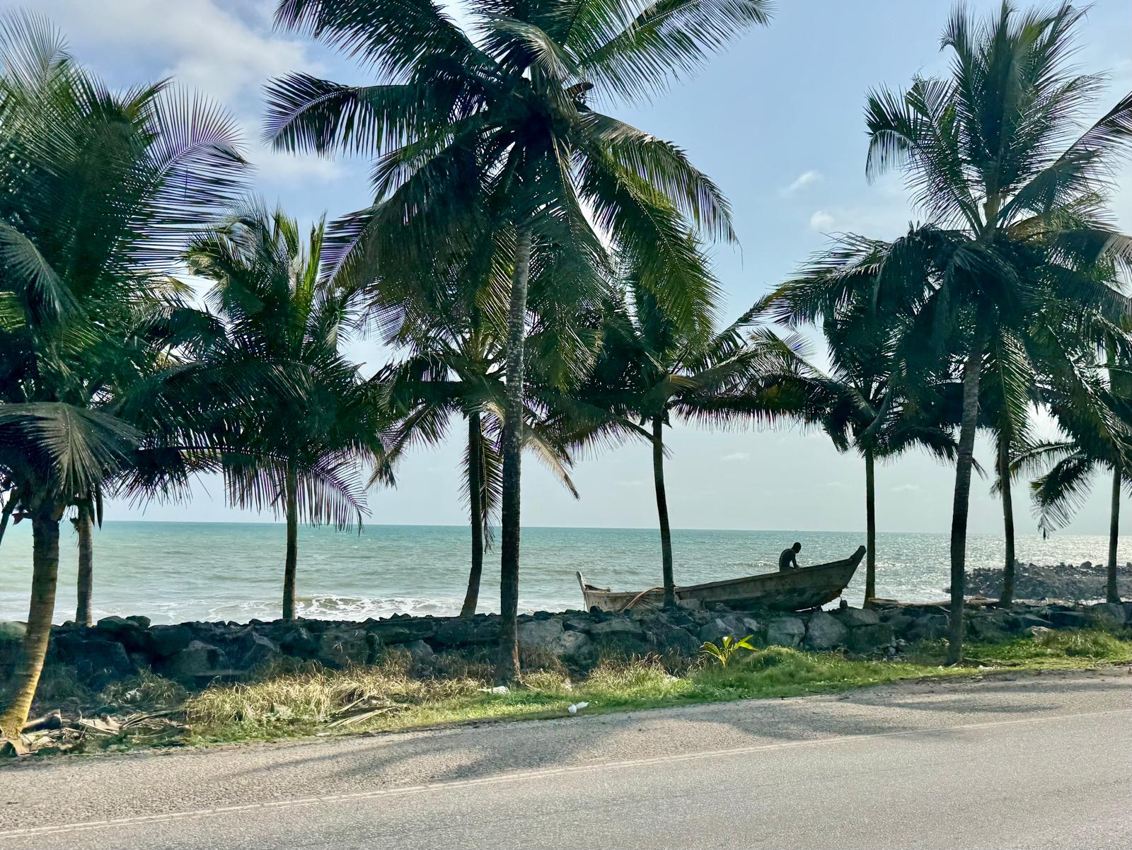 Next we stopped at a beach. A short walk revealed a failed restaurant overlooking a nice beach, where a man showed off his prized catch of two miniature fish.