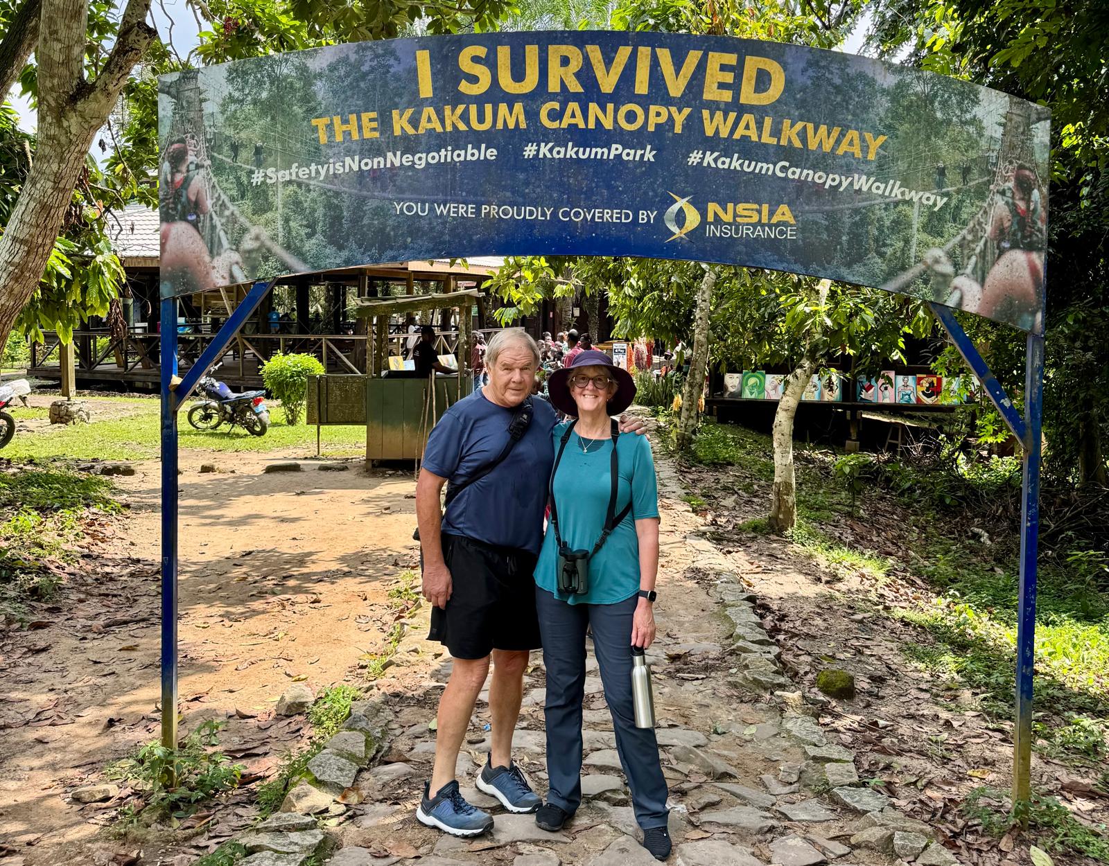 Just on noon, we arrived at Kakum National Park, ~325 square kilometres of pristine rainforest. It is home to a number of animals and hundreds of butterfly species. It also boasts a 350m canopy walk with eight canopy bridges 12-40m high strung between wooden platforms high in the trees. This is what we had come for and we quickly headed off, walking up a fairly steep track to get to the canopy. This attraction draws people from all over and we passed several school groups and other visitors. We were lucky though and had the walk itself pretty much to ourselves, and a small group of maintenance workers. It was a truly impressive experience with the trees towering above us. Unfortunately, given all the visitors, one rarely sees animals in this part of the park, although we did see a few lizards, several brightly coloured butterflies and thousands of red soldier ants, which we were careful to avoid.